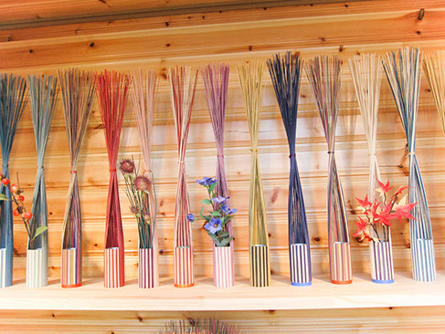 本物のイグサを特殊な技法でカラフルに染め上げたものを使用して一輪挿しを作りました。